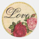 Very pretty Victorian-inspired vintage-style love sticker. It begins with a vintage parchment background that has faint writing on it. A gold frame surrounds the sticker and two roses run along the bottom right. One rose is deep red and the other is light pink. Both are surrounded by deep green leaves. Love is written above them in a large ornate font. You can change the word love to any sentiment that you would like to express. Use this as an envelope seal for wedding invitations, anniversary cards, valentines.