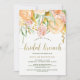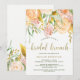 This beautiful bridal brunch invitation features trendy watercolor flowers and leaves in faux gold, peach, pink, and green on a white background. Modern typography appears in faux gold.