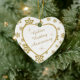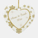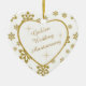 This is an elegant ornament to celebrate a couple's 50th Wedding Anniversary, either at the time of the celebration or for Christmas. It features a white heart framed in gold faux glitter on a matching gold glitter snowflake on white background. Inside the white heart is your text in matching gold, plus twinkling gold star images. The text is fully customisable, so you may make it say whatever you'd like. There is a 2nd text field on the back, which has the same gold snowflake border and inside image. This is a special family keepsake gift that will be treasured forever. *Please note - the image is printed, and the ornament does not contain glitter.*