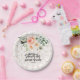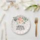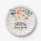 A beautiful bridal shower paper plate featuring a gold wedding ring pattern overlay with a huge watercolor orange Rose in the centre of the plate.