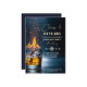 A modern design featuring a gold whiskey glass with burning fire, sparks and ice and elegant calligraphy on a dark blue background. Customize the details for a cool Birthday Celebration.
