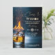 A modern design featuring a gold whiskey glass with burning fire, sparks and ice and elegant calligraphy on a dark blue background. Customize the details for a cool Birthday Celebration.