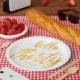 Simple Gold White "Hello Thirty" Birthday party plate template w/ Name & Date.
