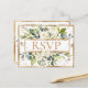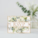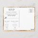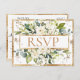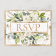 Elegant cream and ivory flowers surrounded with lovely lush greenery and gold splotches. Typography on front of “RSVP”. The back is featured with RSVP information and names of bride and groom. Gold trim and splashes finish this beauty off with elegance at its best. Just beautiful. Budget postcard.