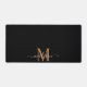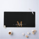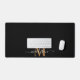 An elegant modern trendy style monogrammed desk mat with a gold serif initial and a white script last name.