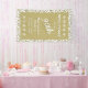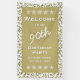 Welcome to my 90th Birthday Party.  A large gold and white banner with white text and templates to make it easy for you to change to your own words, names, and dates.  You can personalise all of the text using the supplied templates.    The sign is trimmed with stars and crosshatch lines.  The frame is a random collage pattern of the number 90.  A great gold and white birthday party theme for an over-the-hill celebration.