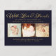 Faux gold foil script cursive elegant lettering on the front of this designer navy blue postcard onto which you add your own new baby photo portraits. Holds 3 baby photos. Easily and quickly personalise this designer professionally printed thank you/sip and see postcard here and now by just typing over the example text and adding your own photographs. Elegant, chic, simple and classy gold script/cursive typography.