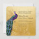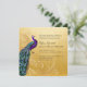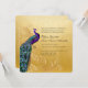Elegant rich gold looking square wedding invitation, with lovely graphics of golden flourishes, and a colourful purple and teal peacock. Text in black is ready to personalise for your wedding day. Matching products are available.