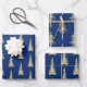 An elegant neutral holiday wrapping paper featuring gold woodland spruce tree patterns on a solid deep navy blue background.