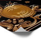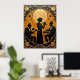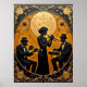 This ornate painting depicts a jazz trio silhouetted in black against a richly textured gold background. A woman stands in the centre playing a trumpet, flanked by two seated musicians, one also with a trumpet and the other playing a keyboard. The background features a large, stylised gold moon, stars, and intricate decorative patterns in black and gold, evoking a glamourous and timeless era of jazz music.
