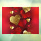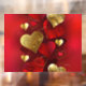 Vertical composition of red and gold, textured valentines made of foil and brocade on red background. Valentines day decorations.