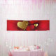 Vertical composition of red and gold, textured valentines made of foil and brocade on red background. Valentines day decorations.