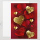 Vertical composition of red and gold, textured valentines made of foil and brocade on red background. Valentines day decorations.