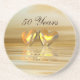 Coaster with my artwork of two gold colored hearts floating on water. Customizable text says "50 Years".