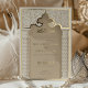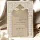 This invitation is a luxurious statement piece, perfect for couples seeking to blend traditional Islamic design with modern elegance. Its golden foil accents illuminate the intricate lace motif, creating a striking contrast against the taupe and beige background. The architectural elements echo the grandeur of a mosque’s entrance, with chevron-patterned columns framing the card and a beautifully stylised arch crowning the text. The use of cream, ecru, and gold hues exudes opulence, while the fine detail in the artwork reflects a deep respect for cultural artistry. This invitation promises a celebration where timeless beauty and contemporary style converge to create an unforgettable experience.