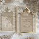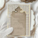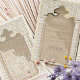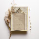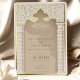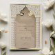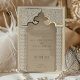 This invitation is a luxurious statement piece, perfect for couples seeking to blend traditional Islamic design with modern elegance. Its golden foil accents illuminate the intricate lace motif, creating a striking contrast against the taupe and beige background. The architectural elements echo the grandeur of a mosque’s entrance, with chevron-patterned columns framing the card and a beautifully stylised arch crowning the text. The use of cream, ecru, and gold hues exudes opulence, while the fine detail in the artwork reflects a deep respect for cultural artistry. This invitation promises a celebration where timeless beauty and contemporary style converge to create an unforgettable experience.