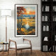 Step into a warm and inviting autumn landscape where golden fields stretch towards distant mountains under a glowing sunset. Tall, slender trees with fiery leaves frame a peaceful stream that guides the eye to a cosy countryside home. This artwork captures the serenity and beauty of fall, making it a perfect piece to bring comfort and seasonal charm to your space.