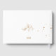 Golden leaves and leaf outlines splashed with gold dust are the focal point for this beautiful wedding guest book. The typewritten font style in all lower-case and modern layout makes this an eye-catching design.