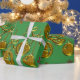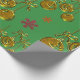 This green and gold Christmas wrap has a pattern of golden Christmas tree baubles and red and orange snowflakes, all on a festive green background.