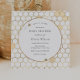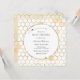 Bee-themed gold baby shower invitation featuring a gold honeycomb pattern and buzzing bees. Personalise with your information or click "Click to customise further" to edit font styles, size and colours.