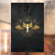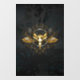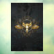 Artistically drawn, symmetrical, composition of black and gold, bird wings, golden, bird skull decorated with gilded pattern on dark, textured background.Gothic style