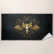 Artistically drawn, symmetrical, composition of black and gold, bird wings, golden, bird skull decorated with gilded pattern on dark, textured background.Gothic style