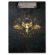 Artistically drawn, symmetrical, composition of black and gold, bird wings, golden, bird skull decorated with gilded pattern on dark, textured background.Gothic style