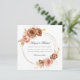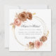 Elegant wedding invitation, with a champagne colour theme, featuring chocolate brown and blush pink roses arranged in a modern wreath. Accentuated with gold embossed imitation leaves, foliage and spatter. Please note, the gold details in this wedding invitation is an imitation of gold embossed.