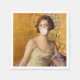 Pop art work of a remix vintage painting of a woman in yellow blowing a pink bubble gum with gold pattern background.