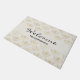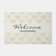 A welcome doormat with an elegant pattern with gold coloured bumble bees in a repeating pattern on a cream coloured background.