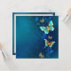 Flying gold, jewellery butterfly on blue textural background. Design with butterflies.
