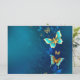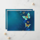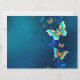 Flying gold, jewellery butterfly on blue textural background. Design with butterflies.