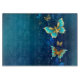 Flying gold, jewellery butterfly on blue textural background. Design with butterflies.