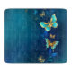 Flying gold, jewellery butterfly on blue textural background. Design with butterflies.
