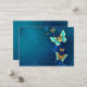Flying gold, jewellery butterfly on blue textural background. Design with butterflies.