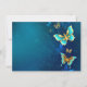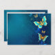 Flying gold, jewellery butterfly on blue textural background. Design with butterflies.