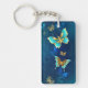 Flying gold, jewellery butterfly on blue textural background. Design with butterflies.