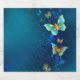 Flying gold, jewellery butterfly on blue textural background. Design with butterflies.