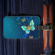 Flying gold, jewellery butterfly on blue textural background. Design with butterflies.