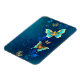 Flying gold, jewellery butterfly on blue textural background. Design with butterflies.