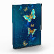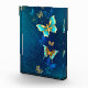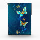 Flying gold, jewellery butterfly on blue textural background. Design with butterflies.