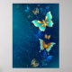 Flying gold, jewellery butterfly on blue textural background. Design with butterflies.