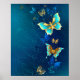 Flying gold, jewellery butterfly on blue textural background. Design with butterflies.