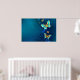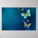 Flying gold, jewellery butterfly on blue textural background. Design with butterflies.