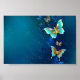 Flying gold, jewellery butterfly on blue textural background. Design with butterflies.