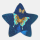 Flying gold, jewellery butterfly on blue textural background. Design with butterflies.