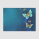 Flying gold, jewellery butterfly on blue textural background. Design with butterflies.