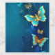 Flying gold, jewellery butterfly on blue textural background. Design with butterflies.