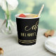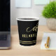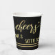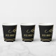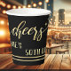 Festive paper cups featuring a gold stylised Cheers text with stars and script text. Beautiful for a birthday, Christmas or other celebration.