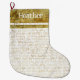 Golden Christmas Name Stocking. Add a Name to this elegant Christmas Stocking designed with festive golden colored trim top along with Seasonal Christmas Text covering the front. To personalize, simply insert the name, replacing the sample text. Makes a great gift for the Holidays.
